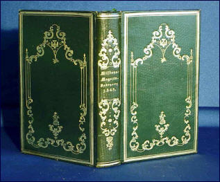 Magazin für die neueste Geschichte der evangelischen Missions- und Bibel-Gesellschaften. Jahrgang 1848. 4 Hefte in einem Band. Mit 3 lithographischen und drei mehrfach gefalteten Tafeln. Dunkelgrüner Chagrinlederband (Einband berieben) mit reicher Romantiker-Vergoldung auf beiden Deckeln und Rücken, Stehkantenvergoldung und Ganzgoldschnitt. Basel, Verlag des Missions-Institutes, 1848. 8°. 144, 1, 264, 166, 226 Seiten, 1 Blatt. Enthält auch über die Missionsarbeit hinausgehende Berichte über Konstantinopel, die Mittelmeerinseln, Griechenland, China, Nordamerika, Kalkutta usw. Die Tafeln zeigen Victoria, den Hafen von Malta und Konstantinopel. Die Falttafeln mit statistischen Angaben sowie Namensverzeichnissen der Missionare.