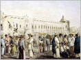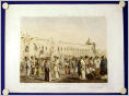 Ansicht einer mexikanischen Strassenszene mit Soldaten: "Trajes Mexicanos. Soldados del Sur" - handkolorierte Original-Lithographie von C. Castro y J. Campillo, um 1860. Oben bezeichnet "Mexico y sus Alrededores". Bildgrösse: 23,5 x 33 cm, Blattgrösse: 31,3 x 45 cm. Fleckig und etwas gewellt, im breiten weissen Rand kleine Einrisse. Dekoratives Blatt in schönem Kolorit.