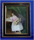 Eine Gitarrenspielerin, in Noten blätternd. Anonymes Gemälde, um 1800. Öl auf Holz, 30 x 24,7 cm. In altem Holzrahmen.